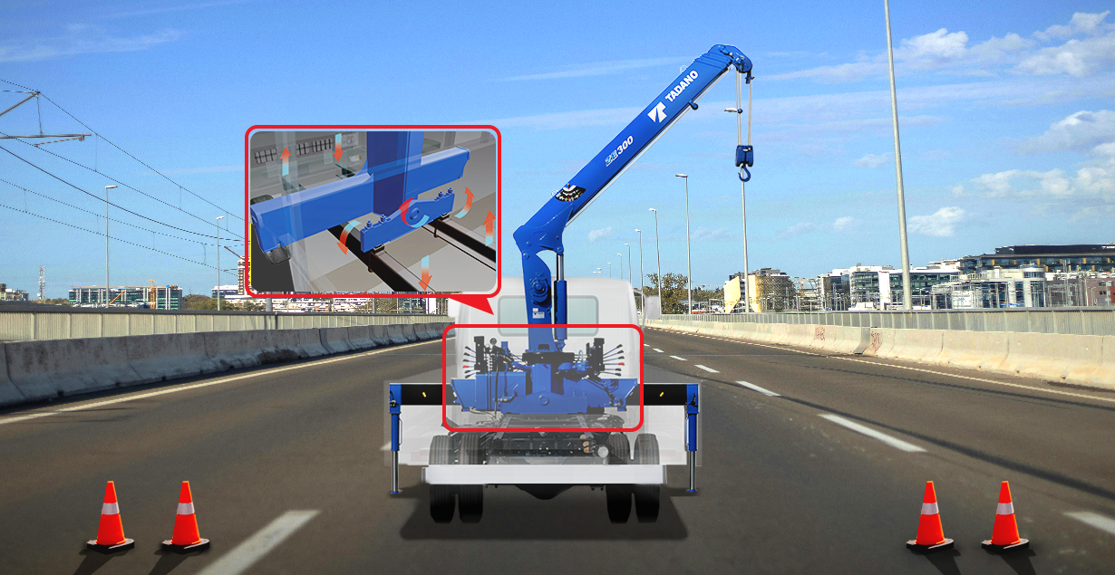 This is the feature that truly sets the Tadano TM-ZE300 apart and lies at the heart of its stability: the Equalizer Crane Support. It’s an intelligent support system engineered specifically to solve the critical issue of pressure concentration on a truck’s chassis.