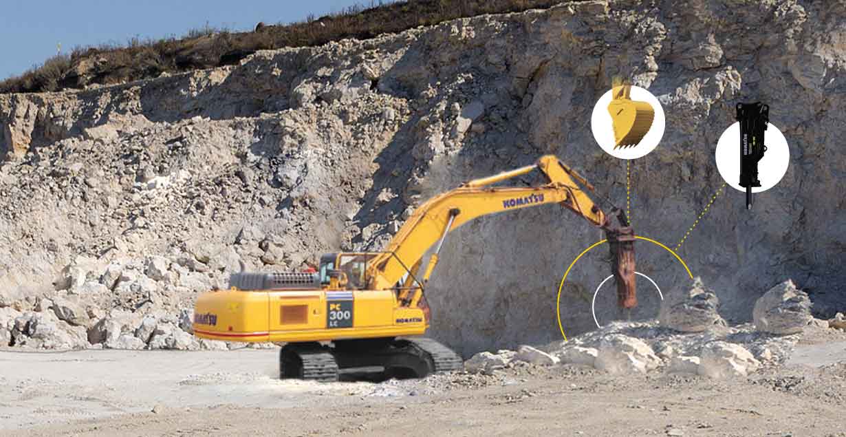- Hydraulic Breaker: When faced with hard rock layers, an excavator can be fitted with a hydraulic breaker. Units like the Komatsu PC300-8M2 from United Tractors come equipped with a built-in breaker mode that optimizes hydraulic flow, effectively turning the excavator into a powerful rock-breaking tool and increasing the unit’s return on investment.